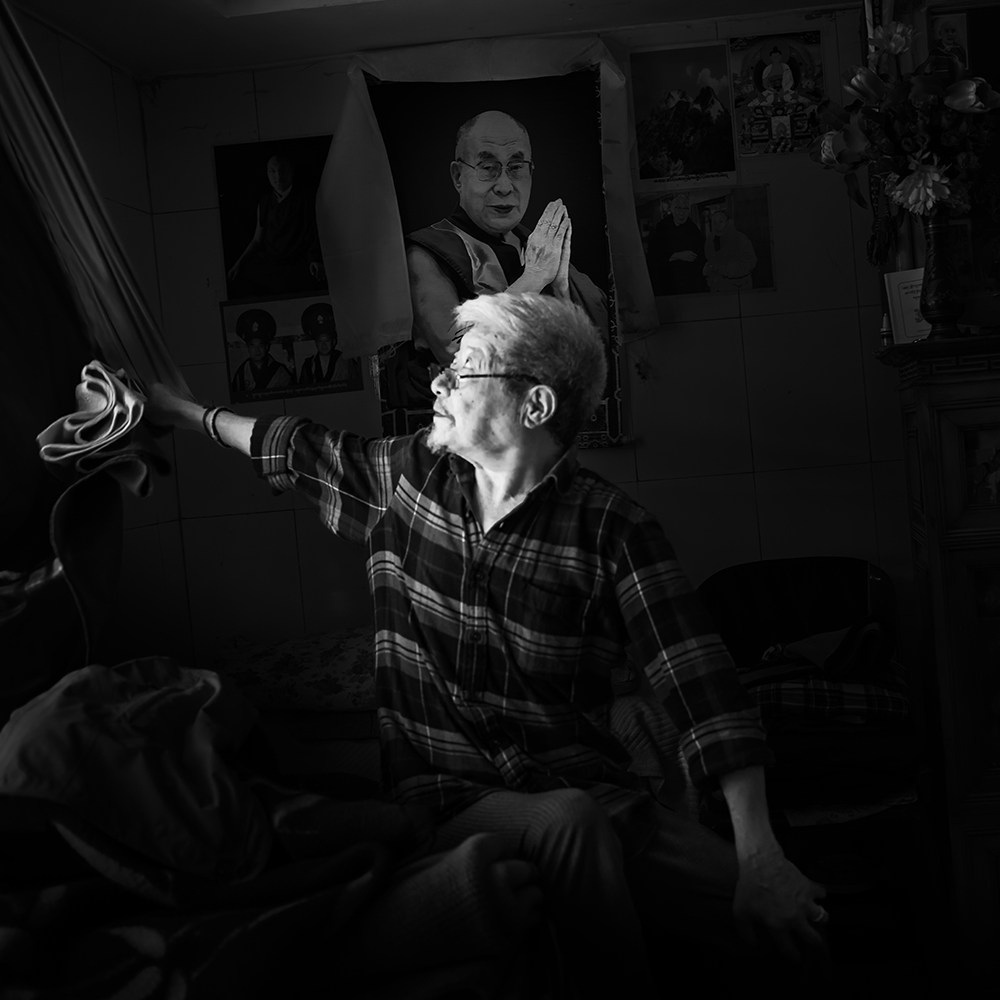 Tsoedup holds a portrait of the Dalai Lama, which usually occupies an important place on the wall on the altar next to the image of Buddha. The Dalai Lama is a great man. I pray for his health every day, and I believe in him unconditionally.